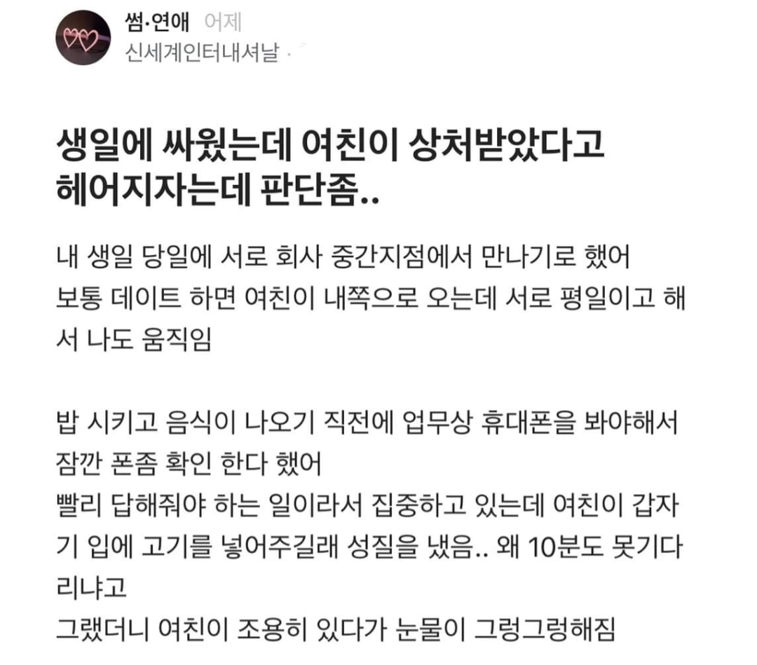 생일날 싸우고 여친이 헤어지자는데 판단좀 해줘
